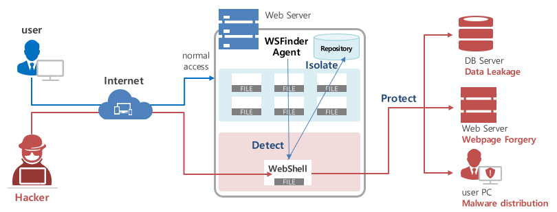 Detect, isolate and remedy a webshell with server-side agent software and provides a dedicated central management system for efficient management even in large web server environments.